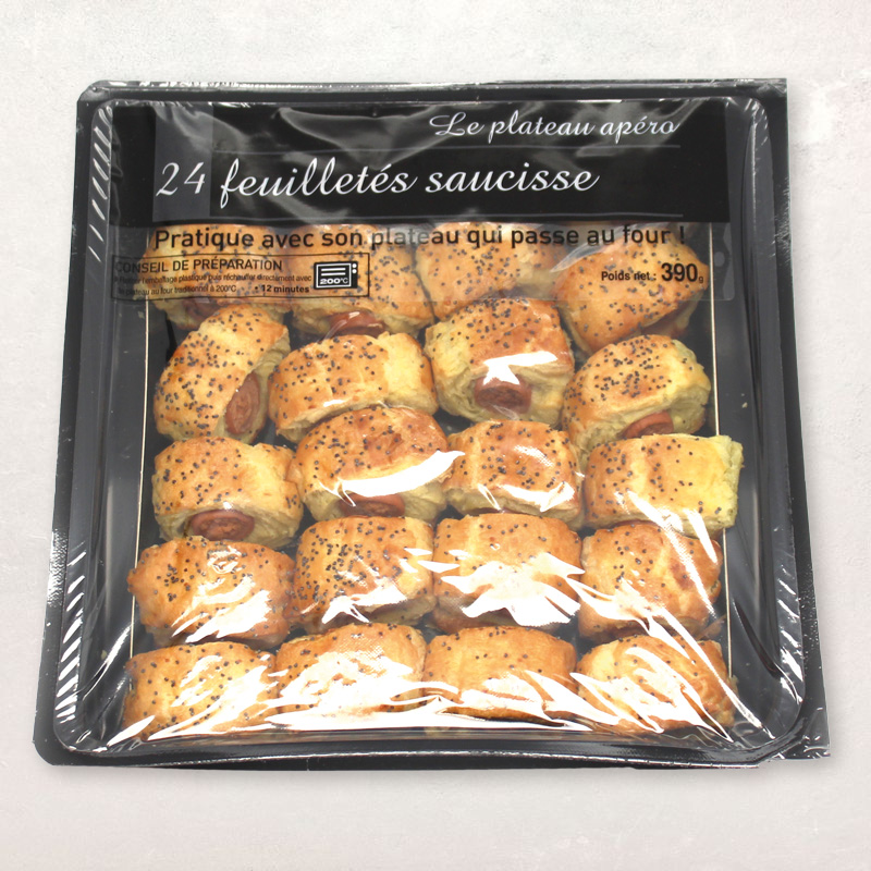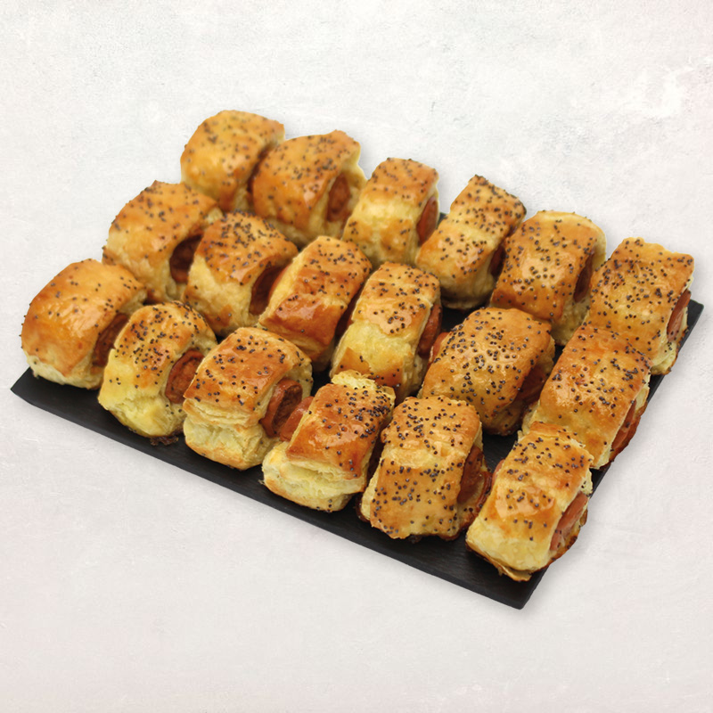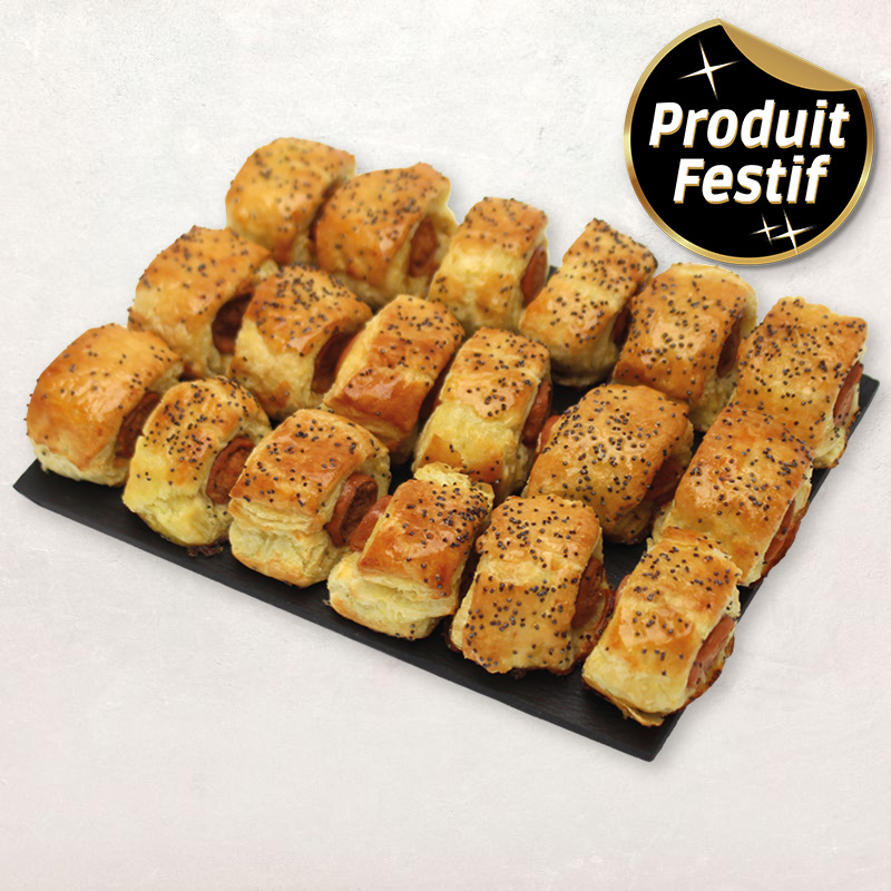 Chaque bouchée associe un feuilletage pur beurre à une saucisse délicatement assaisonnée, pour un mariage simple et savoureux.
