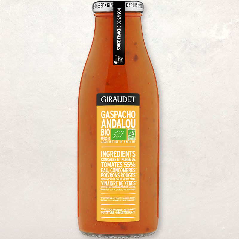 Ce gaspacho andalou BIO, inspiré de la recette traditionnelle espagnole, allie tomates bien mûres, poivrons, concombre et huile d’olive pour une saveur fraîche et équilibrée.