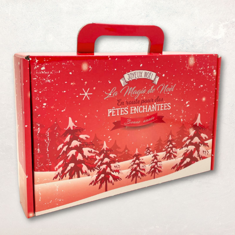 Ce joli coffret cadeau en forme de valisette carton rouge et blanche, est décoré de motifs festifs et élégants. Il est idéal pour composer des assortiments personnalisés à offrir à l'occasion des fêtes de fin d'année.