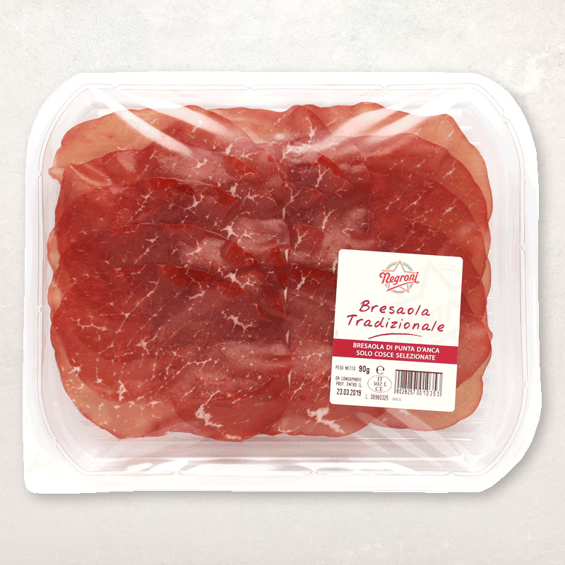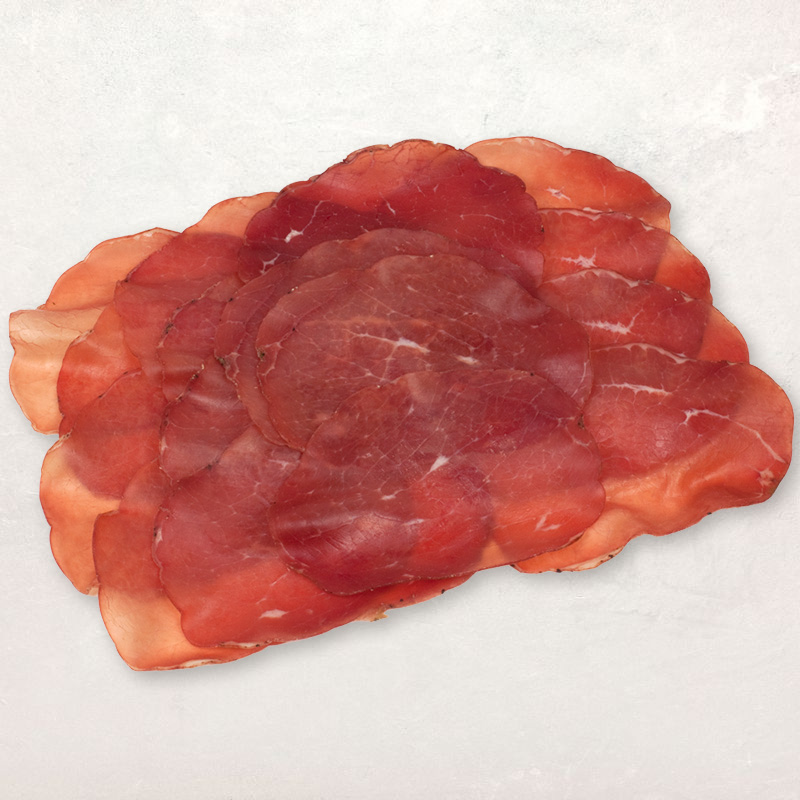 Issue de la cuisse de boeuf, la bresaola est une charcuterie italienne maigre, coupée en très fines tranches, au goût agréable et délicatement parfumé.