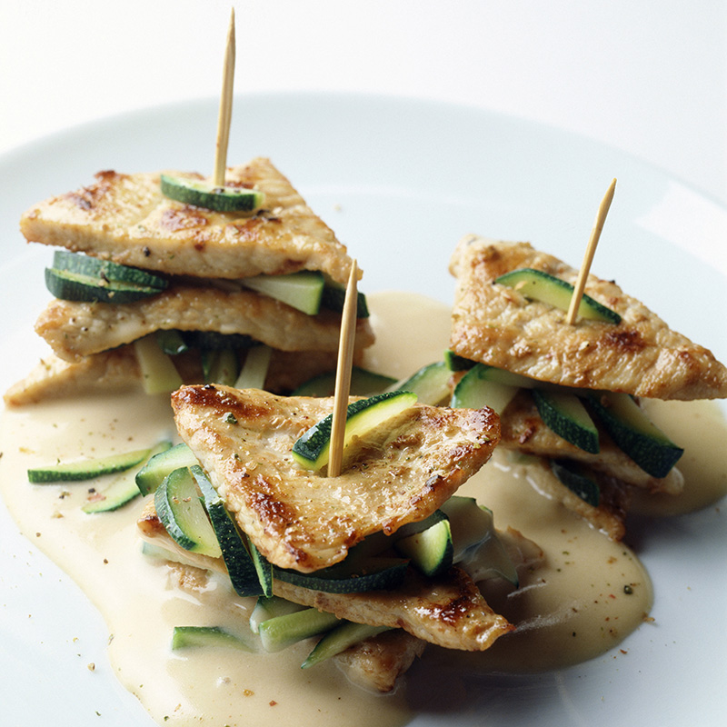 Empilez les mini-escalopes 3 par 3 sur de petits bâtonnets en bois en intercalant les courgettes, posez-les sur un plat ou des assiettes chaudes et gardez au chaud, recouvert de papier aluminium.