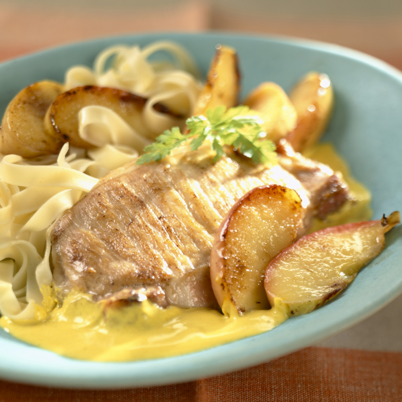 Servez les côtes de porc avec les pommes, des tagliatelles fraîches et la sauce en accompagnement.