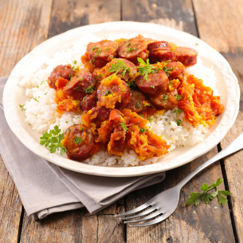 Le rougail saucisse s’accompagne principalement de riz blanc. Il peut également être servi avec du riz parfumé, des haricots rouges, des lentilles vertes, ou même des pâtes.