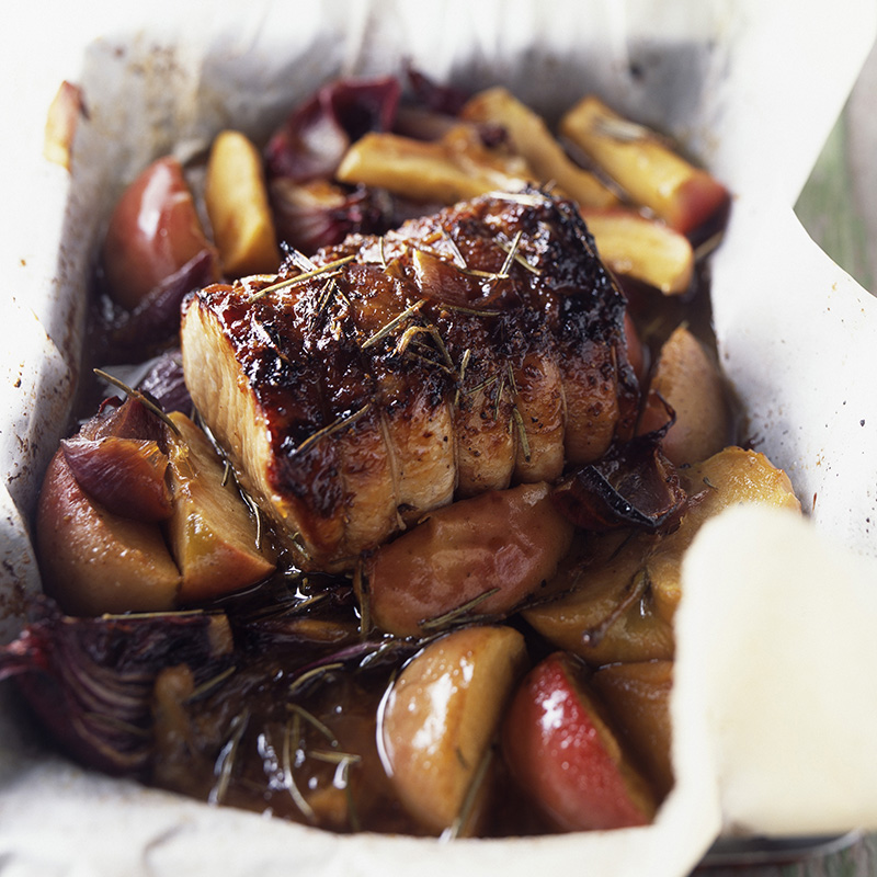 Préparation et cuisson au four du rôti de porc aux pommes, poires et panais caramélisés
