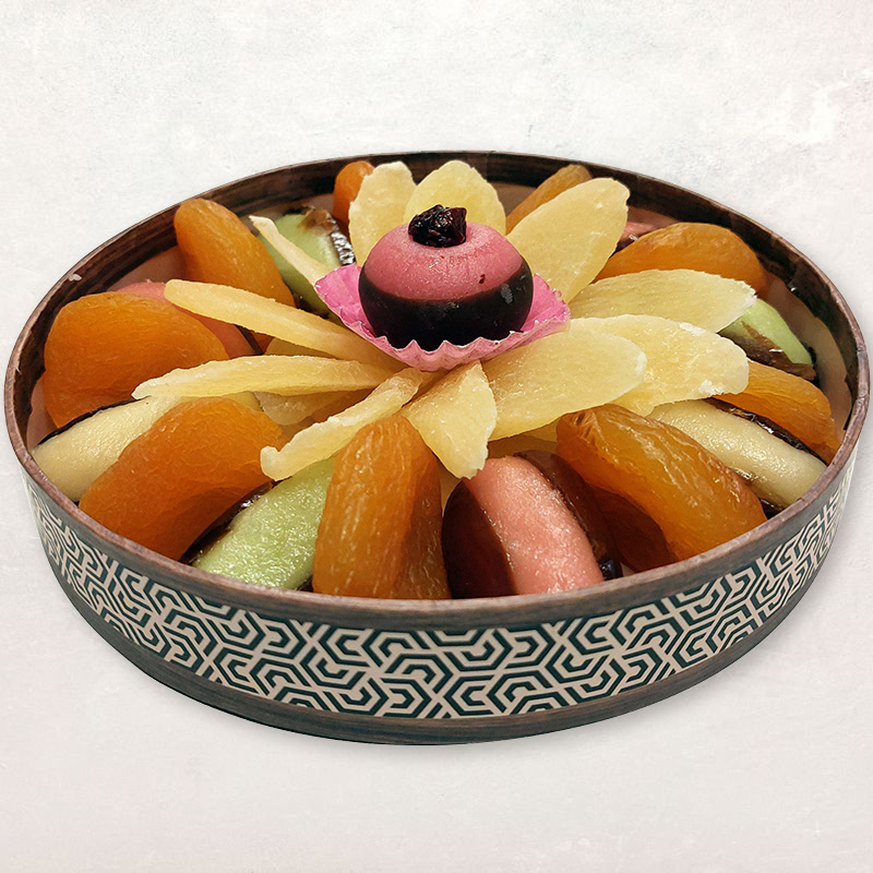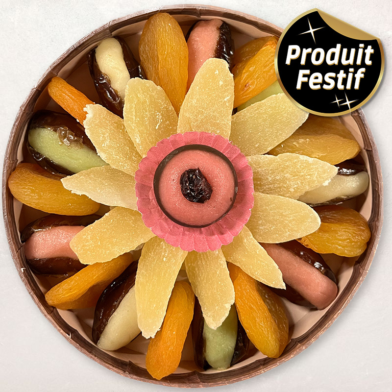 Ce plateau gourmand réunit un assortiment de fruits secs et de douceurs soigneusement sélectionnés pour offrir un équilibre entre saveurs sucrées et textures variées.
