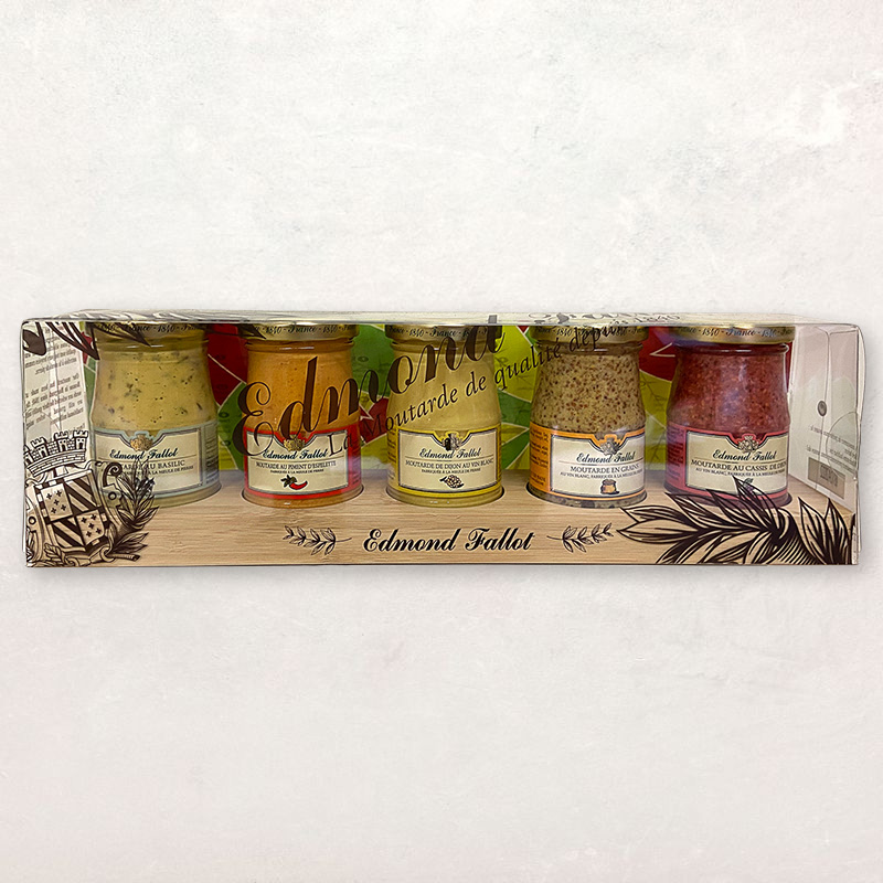 Ce coffret contient cinq variétés de moutarde pour accompagner vos viandes: Moutarde au cassis de Dijon, Moutarde en grains, Moutarde de Dijon au vin blanc, Moutarde au piment d'Espelette, Moutarde au basilic