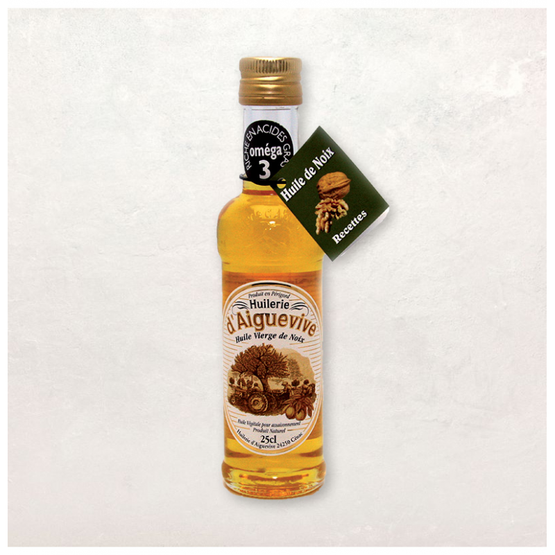 L’Huile de Noix d’Aiguevive est issue de cerneaux de noix de premier choix issus de la production locale ou de la COOP CERNO Périgord.