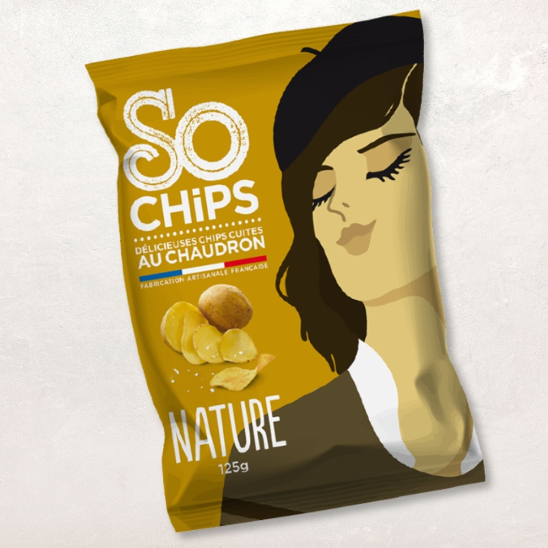 Ces chips nature sont fabriquées dans l’Oise à partir de pommes de terre françaises, tranchées épaisses avec leur peau et cuites lentement au chaudron selon un procédé artisanal.