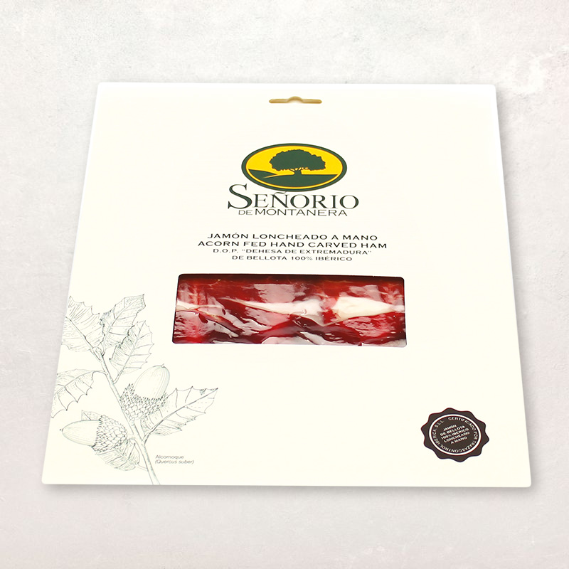 Ces jambons sec Bellota 100% Ibérico, porteurs du label AOP Dehesa de Extremadura comptent parmi les meilleurs jambons du monde. Ils sont issus de porcs de race pure ibérique pata negra et nourris de glands (bellota) qu'ils trouvent dans la dehesa des prairies caillouteuses plantées de chênes dans lesquelles ils vivent en liberté. Cette alimentation leur garantit un gras épais et goûteux caractéristique du jambon Bellota 100% Ibérico au savoureux parfum de noisette.