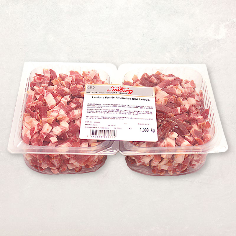 Ces petits lardons fumés sont de petits morceaux de lard coupés en forme de bâtonnets fins et fumés pour leur donner une saveur intense et délicieuse.