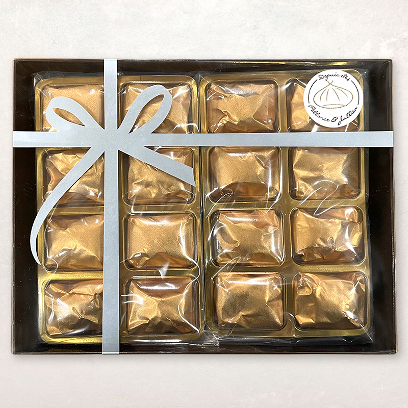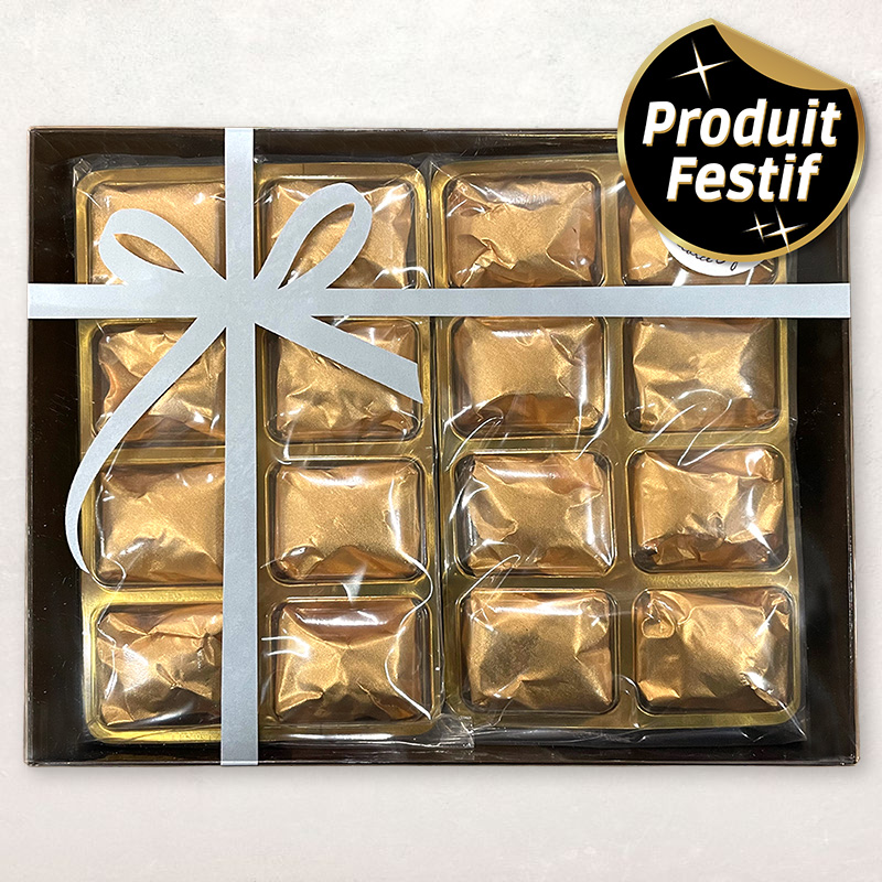Ce coffret somptueux renferme 16 délicieux marrons glacés, chacun enveloppé dans une fine couche d'or, pour une expérience gustative véritablement luxueuse.