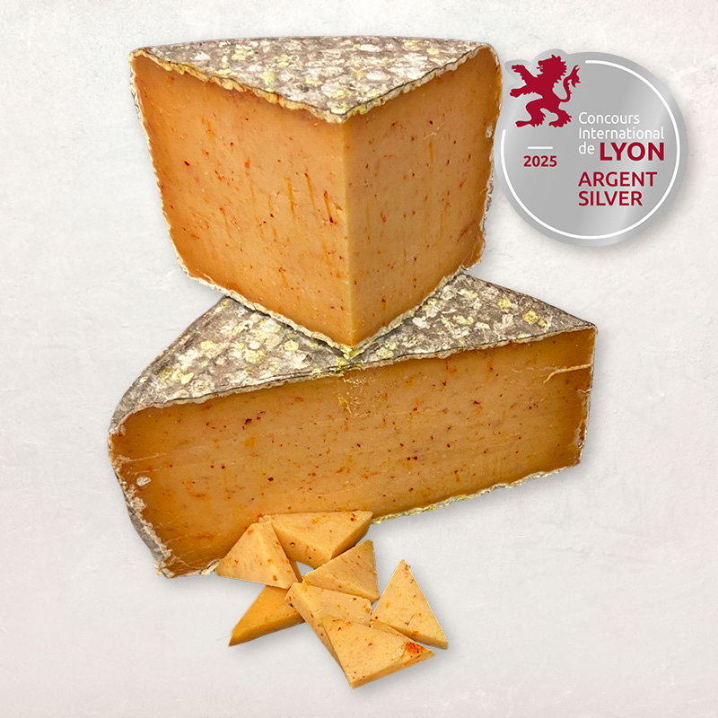 Affinée dans les caves de l’Aveyron, cette tomme de brebis associe la douceur lactée du lait de brebis à la chaleur aromatique du piment d’Espelette AOP. Sa pâte souple, légèrement ivoire, dégage un parfum délicat et développe en bouche un équilibre subtil entre fondant, rondeur et une pointe de piquant très agréable. Le piment d’Espelette apporte une note chaleureuse, relevée mais jamais agressive, parfaite pour les amateurs de saveurs gourmandes. Distinguée par la Médaille d’Argent au Concours International de Lyon 2025, elle séduit par sa finesse et son caractère bien dosé, idéale pour ceux qui apprécient les fromages au tempérament gourmand sans excès de puissance.