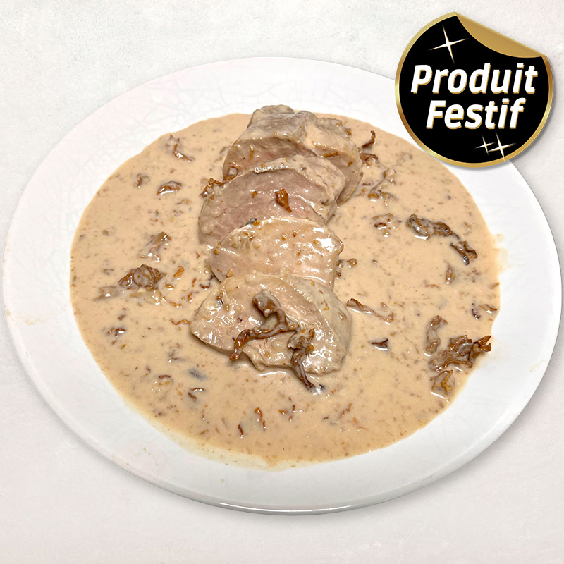 Ce filet mignon de porc est longuement mijoté dans une sauce onctueuse aux girolles, qui lui apporte des arômes boisés et délicatement fruités.