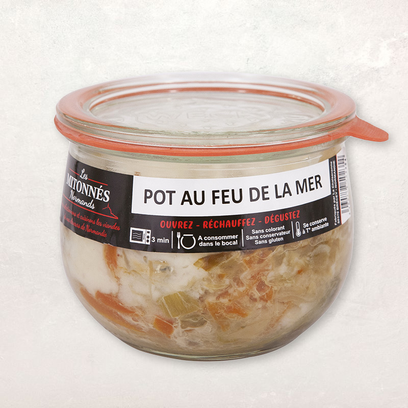 Sans colorant ni conservateur, ce pot-au-feu de la mer est préparé suivant une recette traditionnelle composée de cabillaud (origine France) et des légumes frais provenant exclusivement de Normandie (hors périodes de rupture saisonnière).