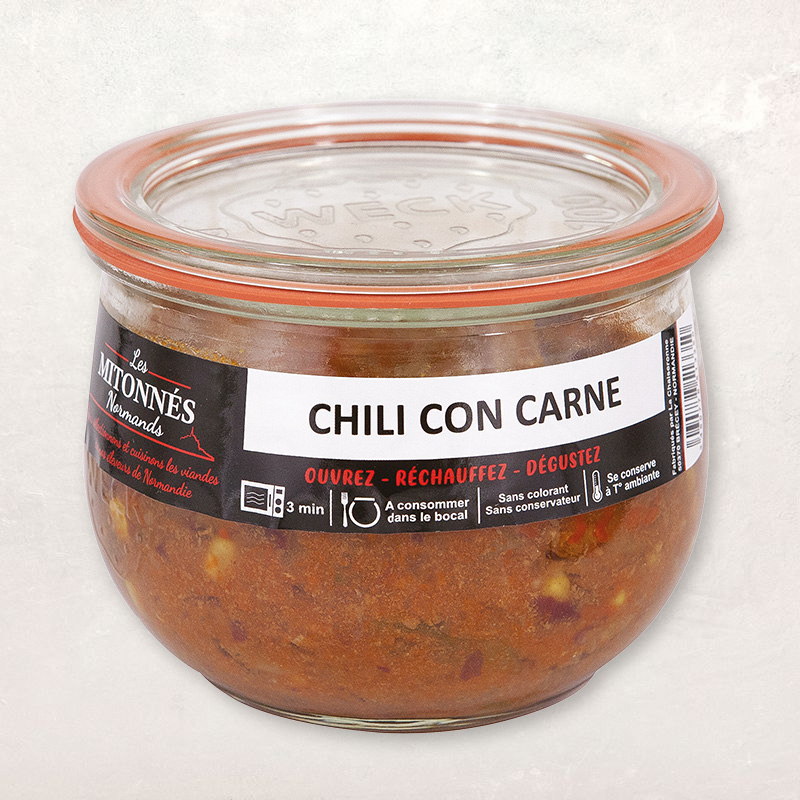 Sans colorant ni conservateur, ce chili con carne est préparé suivant une recette traditionnelle composée de viande bovine de race Normande et des légumes frais provenant principalement de Normandie (hors périodes de rupture saisonnière).