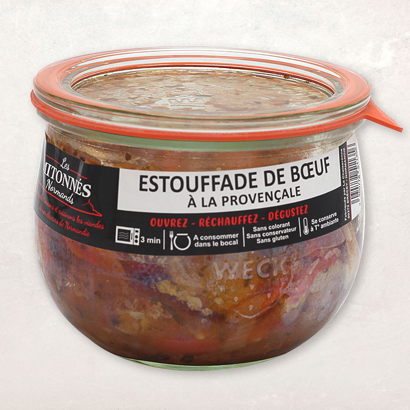Sans colorant ni conservateur, cette estouffade est préparée suivant une recette traditionnelle composée de viande bovine de race Normande et des légumes frais provenant principalement de Normandie (hors périodes de rupture saisonnière).