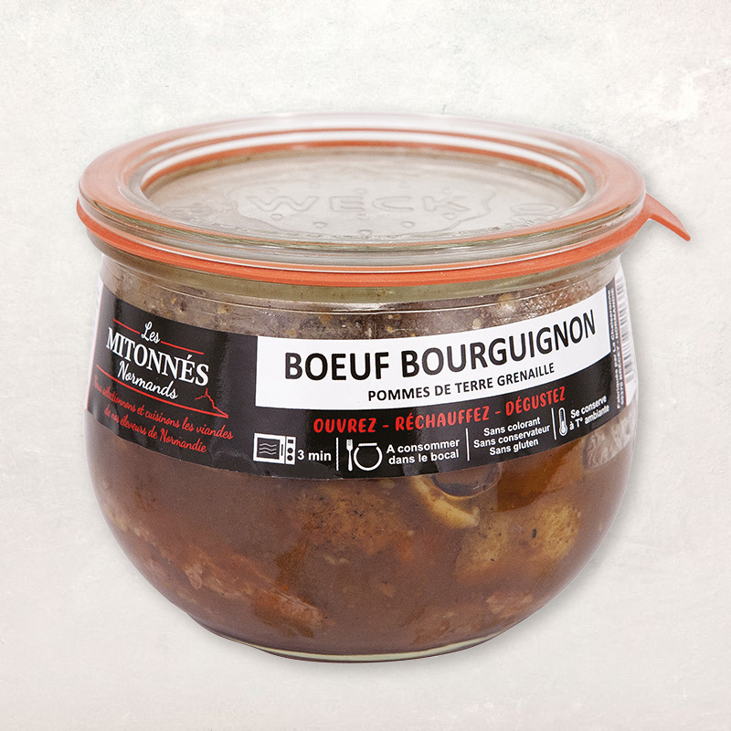 Sans colorant ni conservateur, ce bœuf bourguignon est préparé suivant une recette traditionnelle composée de viande bovine de race Normande et des légumes frais provenant principalement de Normandie (hors périodes de rupture saisonnière).