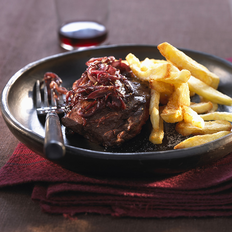 Accompagnez les bavettes de frites dorées et croustillantes ou, pour changer, de frites de patates douces qui s'accorderont à merveille avec les échalotes.
