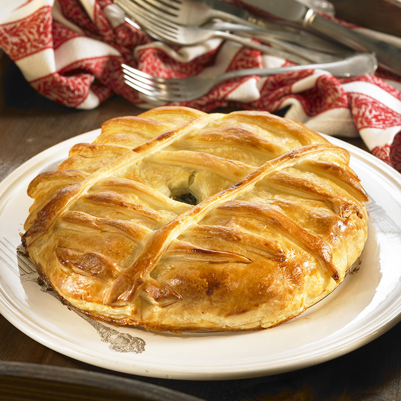 Répartissez la viande sur le fond de tarte et recouvrez de la deuxième pâte feuilletée. Pincez bord à bord les 2 pâtes feuilletées avec les doigts et roulez ensemble les bords pour les rendre jointives.
