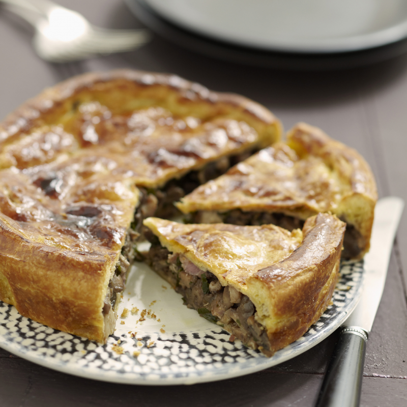 Garnissez la tourtière des 250 grammes de pâte. Répartissez-y la préparation au veau, puis recouvrez des morilles aux échalotes.