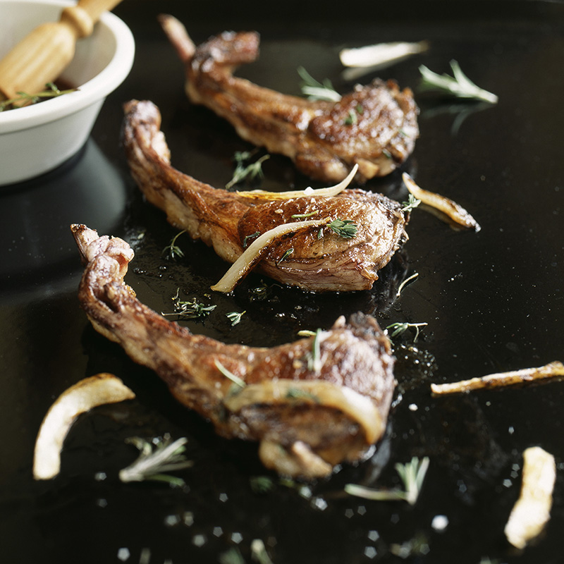 Préparation et cuisson à la plancha des côtelettes d'agneau aux oignons et romarin