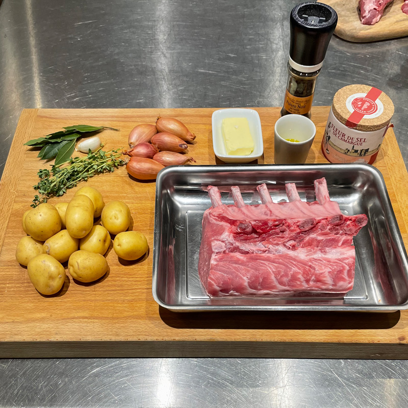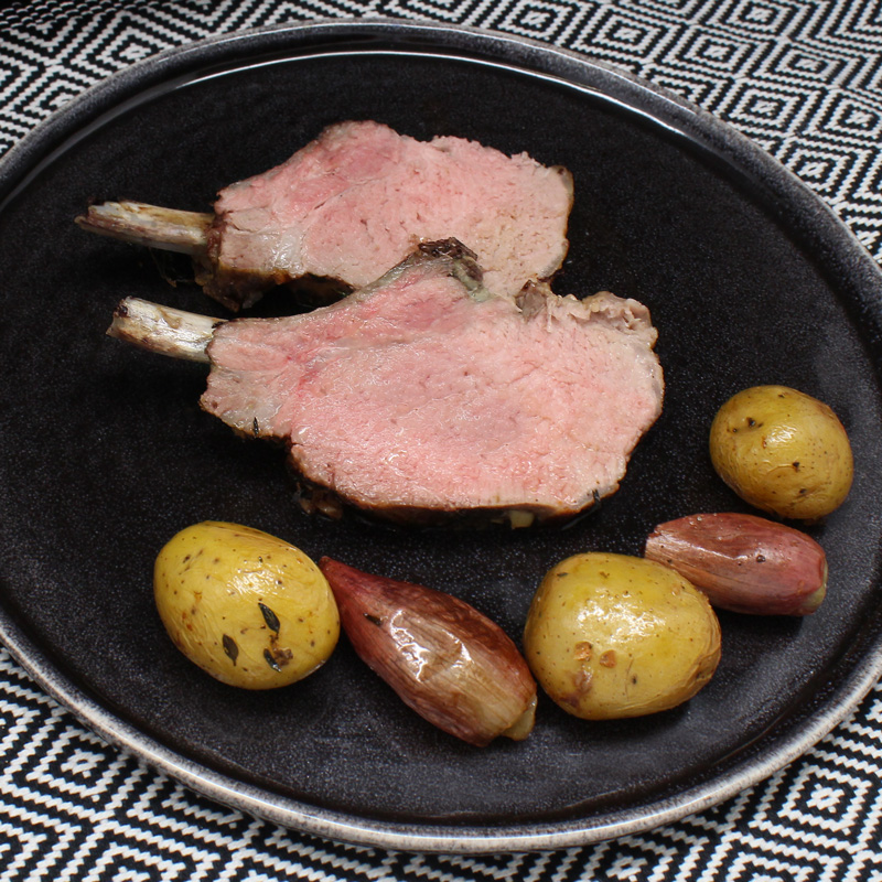 Recette de carré de porc ibérique rôti, échalotes et pommes de terre rattes