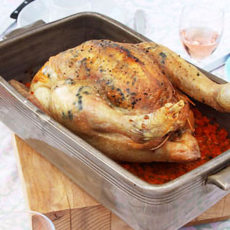 Étalez la fin de la farce au fond d’un plat allant au four, déposez votre poulet ou chapon dessus, badigeonnez-le d’huile d’olive et enfournez à 230°C.