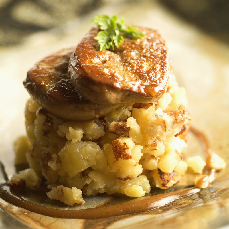Recette du foie gras poêlé et ses pommes de terre rissolées au foie gras