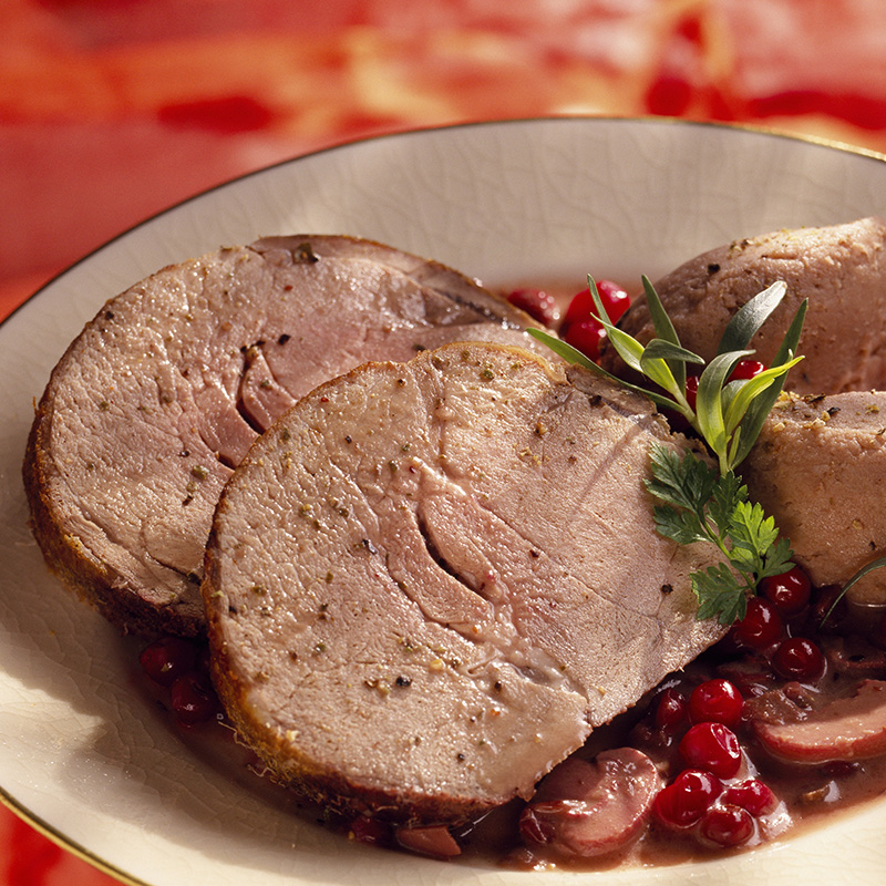 Servez le rôti coupé en tranches avec la préparation aux airelles et aux champignons et accompagné de purée de marrons.