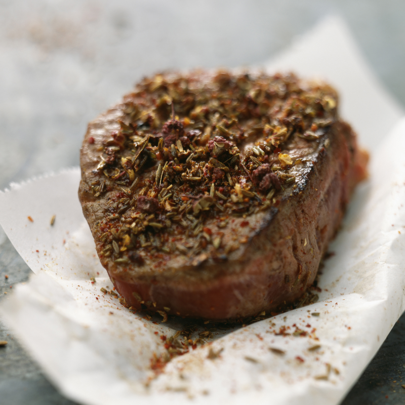 Prolongez la cuisson sur feu moyen, selon l'épaisseur des pavés et le goût de chacun. Posez les pavés sur assiettes chaudes en parsemant très généreusement chaque pavé du mélange aux épices. Ajoutez une belle noisette de beurre et servez de suite.