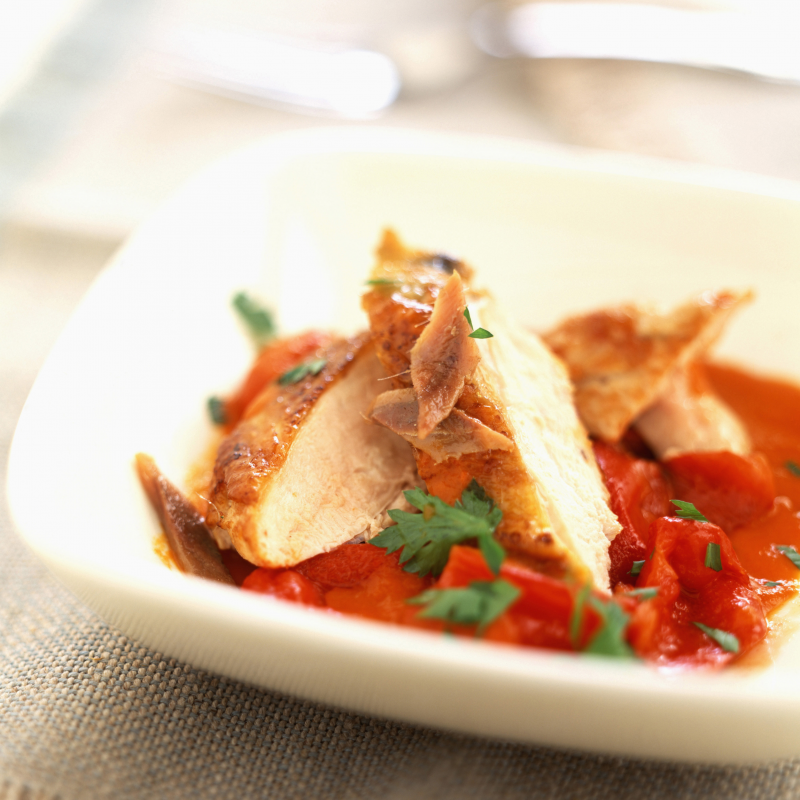 Lorsqu'ils sont cuits, coupez les filets de poulet en larges tranches dans l'épaisseur, ajoutez-les à la fondue de poivrons-tomates-anchois chaude, parsemez de persil fraîchement ciselé et servez de suite.