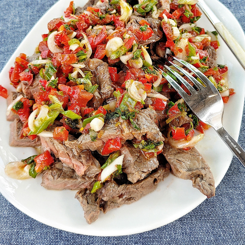 Au moment du service, couper les entrecôtes cuites en lamelles et déposer par-dessus la sauce vierge.