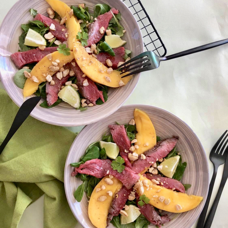 Couper le rôti de boeuf en 12 fines lanières (quatre tranches, chacune coupée en trois). Éplucher et tailler la mangue en six morceaux.