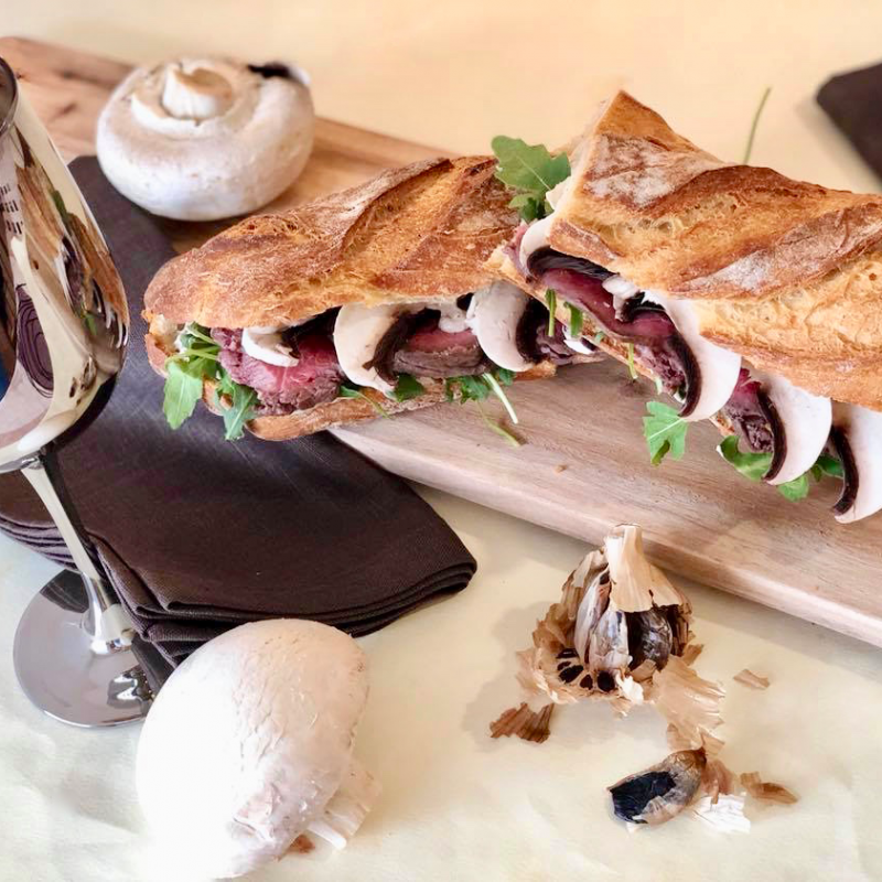 Couper le pain en deux parts égales puis couper chaque part dans le sens de la longueur sur un seul côté. Étaler la sauce à l’ail noir sur les deux faces internes.
