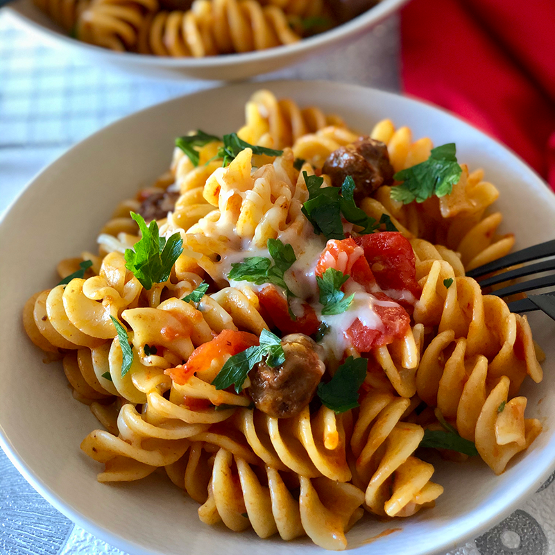 Une recette toute simple de pâtes aux poivrons et merguez qui ravira petits et grands