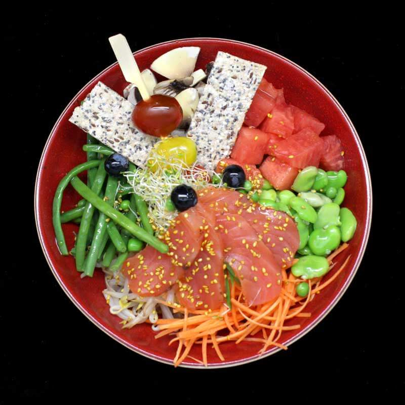 Disposez tous les ingrédients dans des bols en commençant par le riz de Camargue, puis champignons, pastèque, germes de soja, haricots verts et carotte râpée.