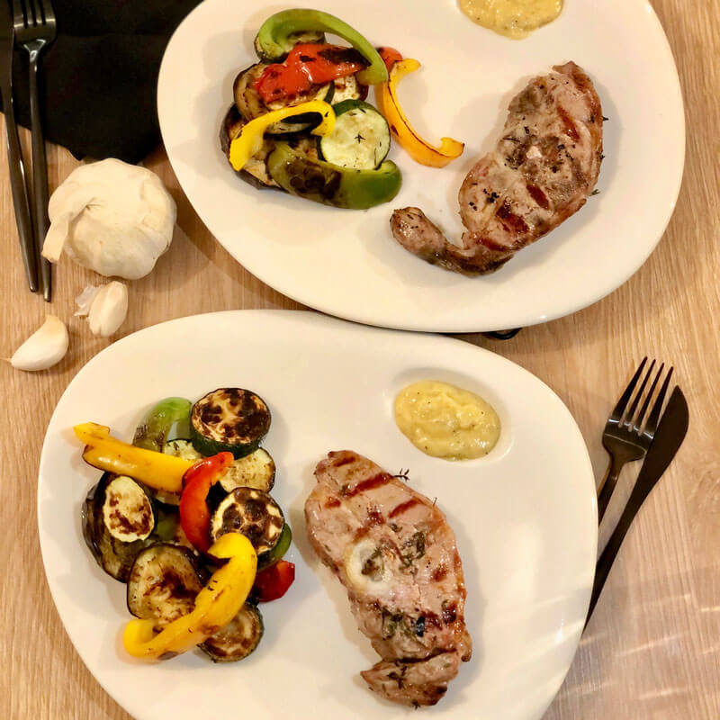 Faire chauffer un grill pour la viande et une plancha ou une poêle pour les légumes. Faire revenir les légumes environ 5 minutes par face.