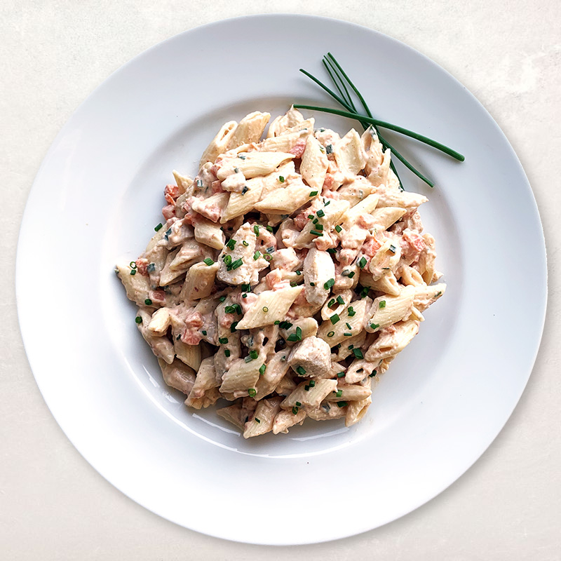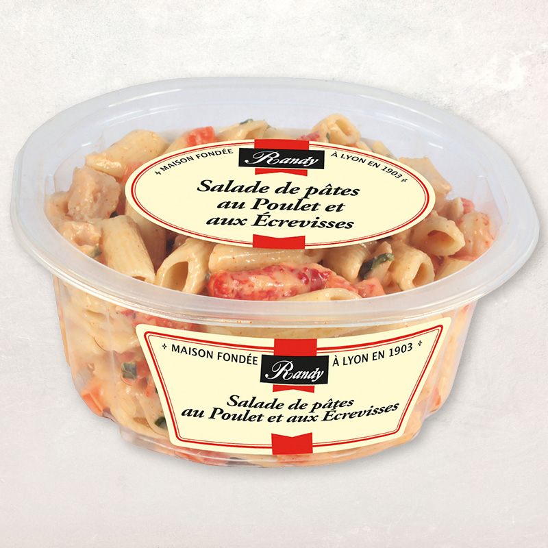 Ingrédients: pâtes cuites 40% (eau, semoule de BLE, blanc d'ŒUF en poudre, sel), eau,poulet traité en salaison cuit rôti 10% (viande de poulet (Origine:UE)10,5g*,fécule de pomme de terre, dextrose, sel), carottes cuites 10%, huile de colza, CREME, ECREVISSES 4%, tomate en purée concentrée, jus de citron à base de concentré, épices, vinaigre de cidre, moutarde (eau, graines de MOUTARDE, vinaigre d'alcool, sel ),vinaigre d'alcool, jaune d'ŒUF en poudre, sel, sirop de glucose, amidon transformé, arôme naturel (CRUSTACE,POISSON).