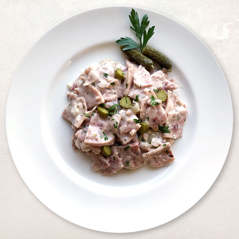 Grand classique de la cuisine française, cette savoureuse salade de museau vinaigrette à base de porc et d'ingrédients de qualité est prête à déguster.