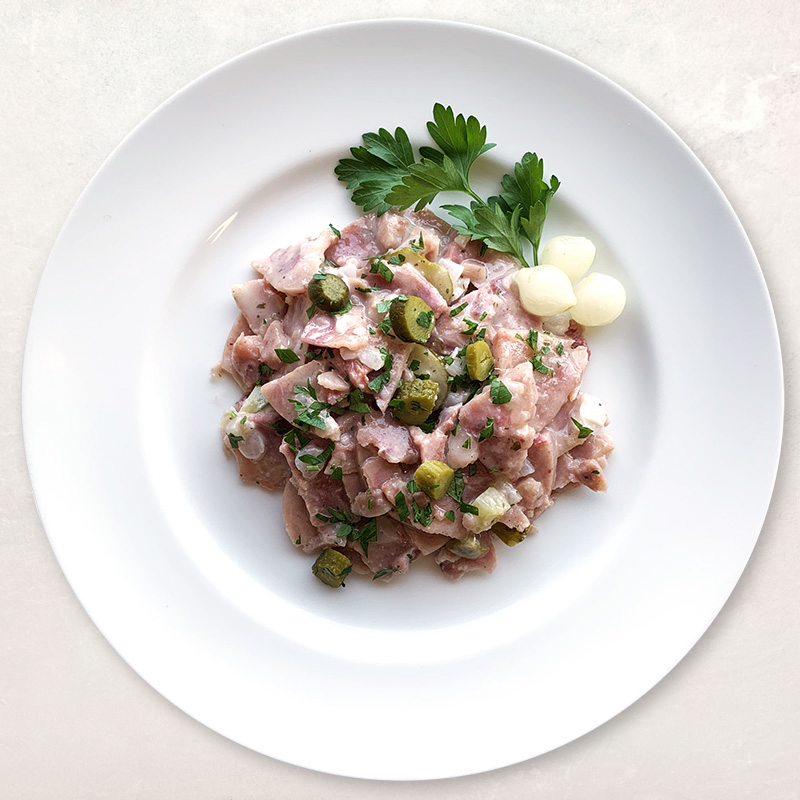 Grand classique de la cuisine française, cette savoureuse salade de museau vinaigrette à base de boeuf et d'ingrédients de qualité est prête à déguster.
