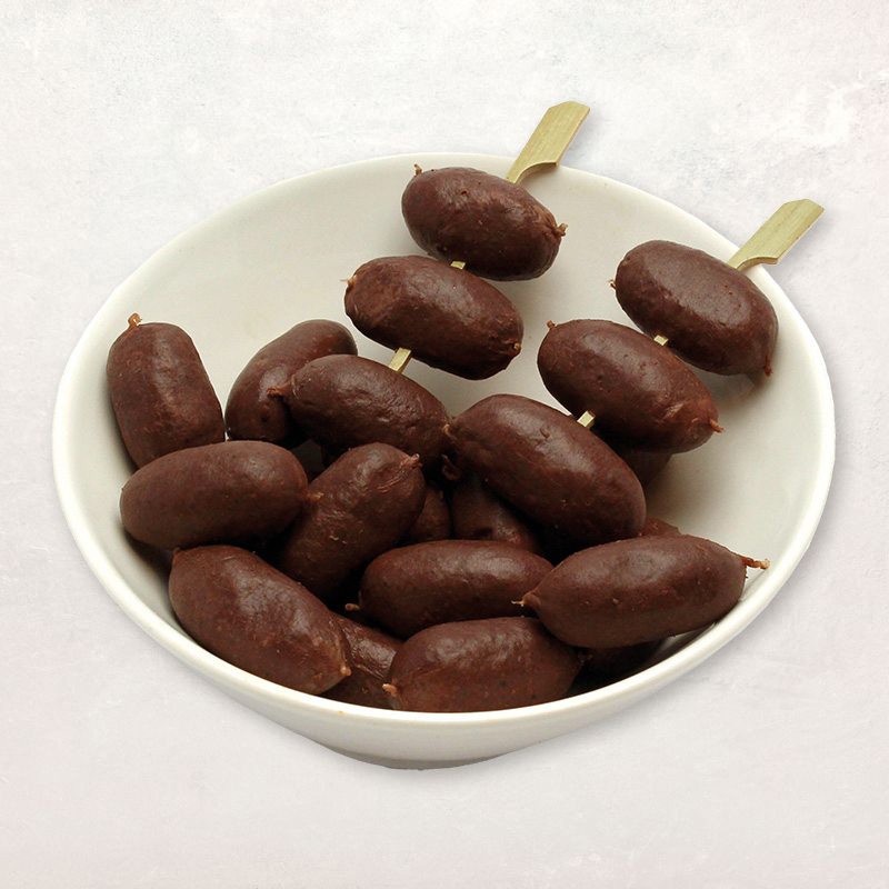 Ces petites saucisses de boudin noir créole précuites sont préparées par notre charcutier-traiteur au Pin en Mauges au cœur de l'Anjou.