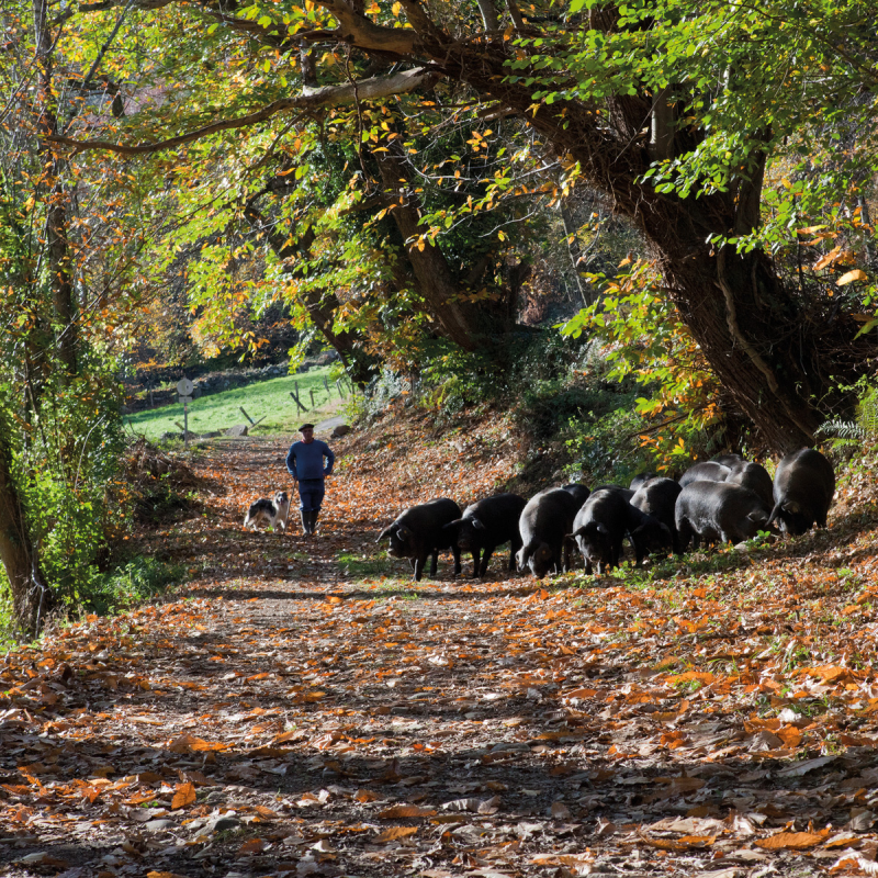 Élevé dans le Piémont Pyrénéen, nourri de céréales complètes et de végétaux sauvages, ce porc noir à croissance lente offre une saveur persillée unique.
