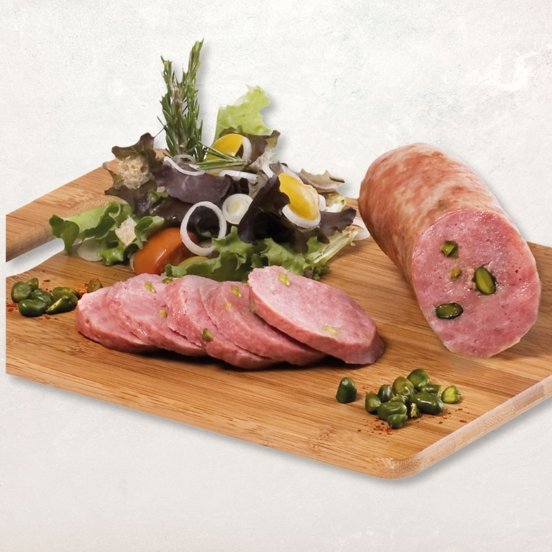 Avec une teneur en pistaches de 3%, chaque bouchée offre un croquant irrésistible qui complète à merveille la texture tendre et juteuse du saucisson.