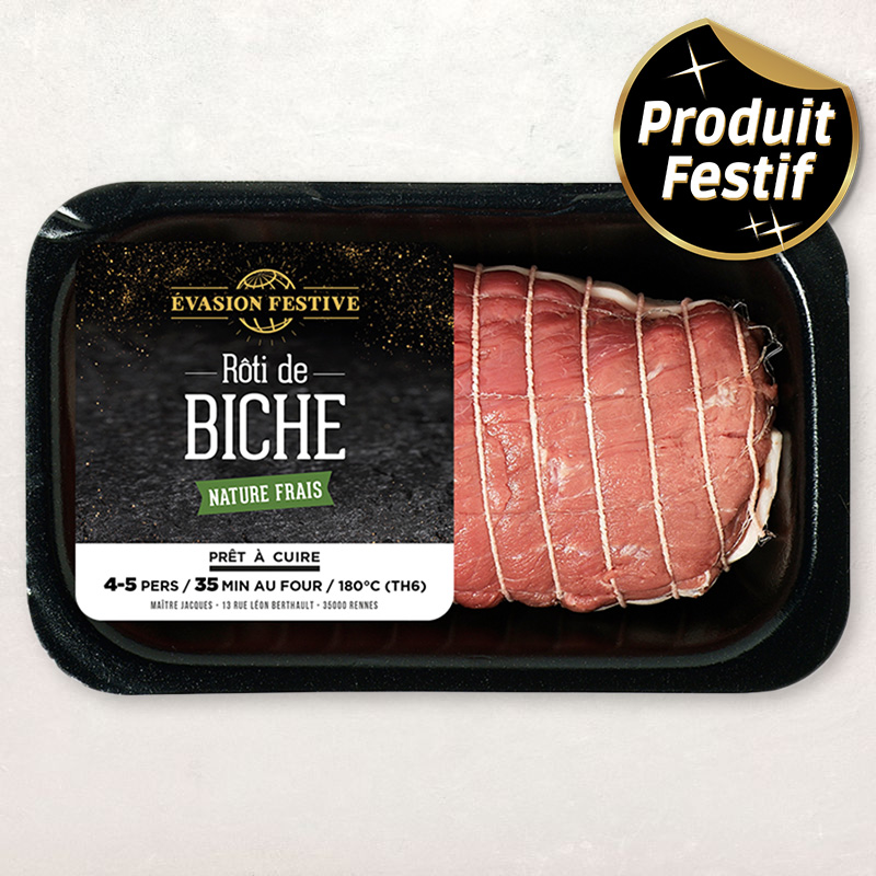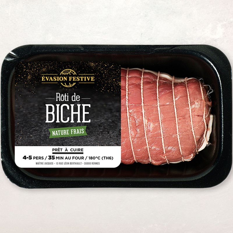 Ce rôti de biche nature offre une viande tendre et raffinée, au goût délicatement boisé et typique du gibier.
